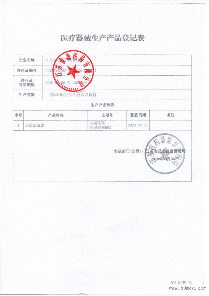 | 發(fā)證機(jī)構(gòu): | ??江蘇省藥品監(jiān)督管理局 | 發(fā)證時(shí)間 : | ??2020-08-06 |