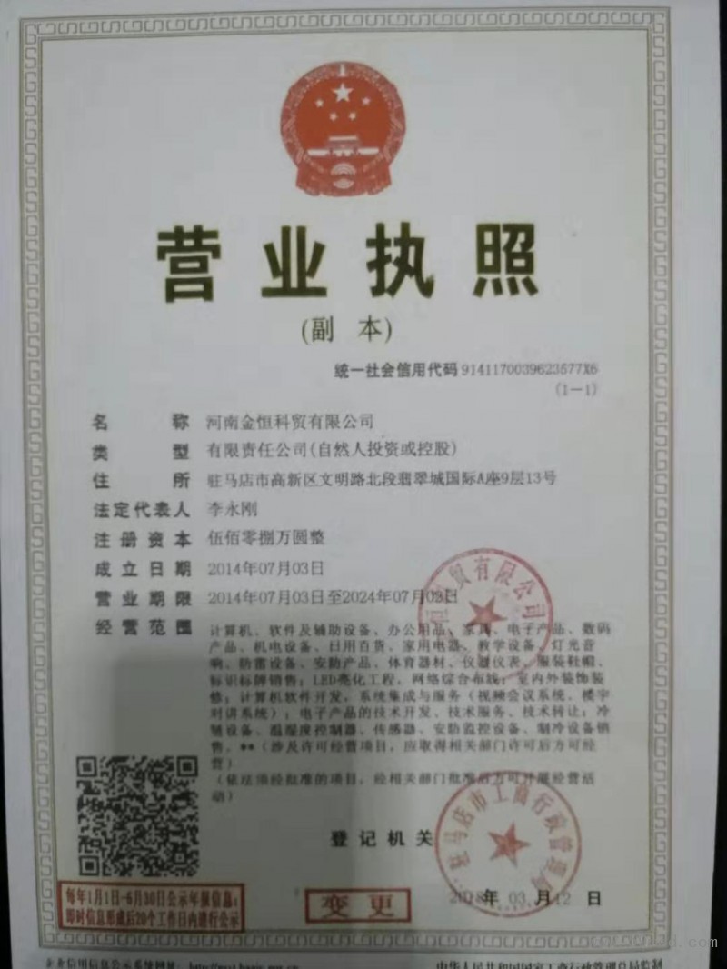 | 發(fā)證機(jī)構(gòu): | ??駐馬店市工商行政管理局 | 發(fā)證時(shí)間 : | ??2014-07-03 |