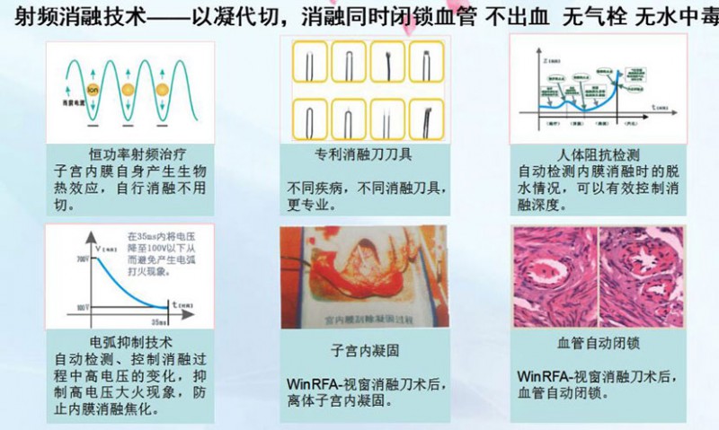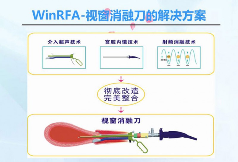 WinRFA•視窗消融刀是在雙重可視的監(jiān)控下,通過具有剪切、止血、凝固、剔除四大功能的消融刀具經(jīng)陰道、宮頸等自然腔道,將射頻電磁波準(zhǔn)確地介入到病變部位上,射頻電磁波激發(fā)病變組織的細(xì)胞進(jìn)行等離子振蕩,離子相互摩擦產(chǎn)生生物高熱效應(yīng),溫度達(dá)到80-100度,從而有效的消融病變組織并凝固血管,射頻治療系統(tǒng)能智能控制病變組織的變性程度和范圍,最后使病變組織變性、壞死和排出體外,達(dá)到治療子宮出血(DUB)、子宮切口(瘢痕)妊娠、腺肌瘤(病)等疾病的目的。